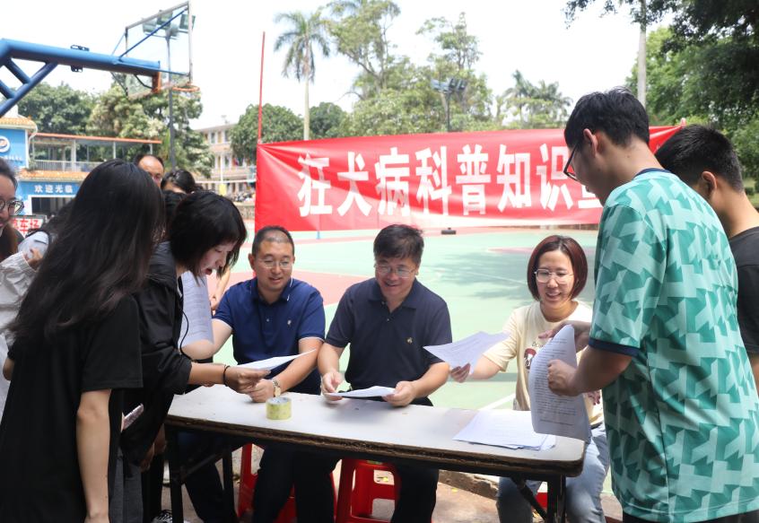 老师和学生们在活动现场拉起了“狂犬病科普知识宣传”字样的醒目的横幅,准备了足够的宣传单。宣传单上就狂犬病的概念、潜伏期、传播途径、临床症状及防治等相关问题给出了详细的解释。并且在宣传单底部附上湛江市疾病预防控制中心联系方式,可对注射狂犬疫苗相关内容进行咨询。学生们对本次宣讲内容非常感兴趣,围着老师认真聆听和询问。有同学表示,通过阅读宣传资料和咨询,他们对狂犬病有了进一步的认识,会与身边的好友和家里人分享这次的收获。