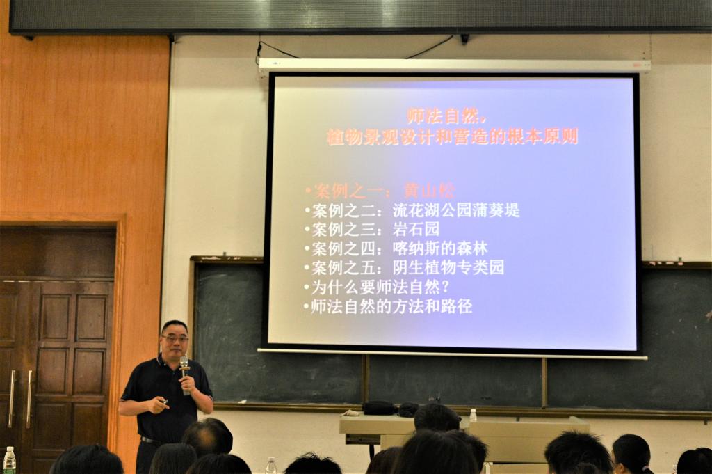 受银河集团9873com邀请,5月20日上午,全国优秀科技工作者、浙江农林大学风景园林与建筑学院名誉院长、浙江省风景园林学科带头人包志毅教授,在兴农楼109室为师生作《师法自然———设计和营造植物景观》的专题讲座。讲座由吴刘萍教授主持,园林系部分教师、研究生、本科生近150余人参加报告会。