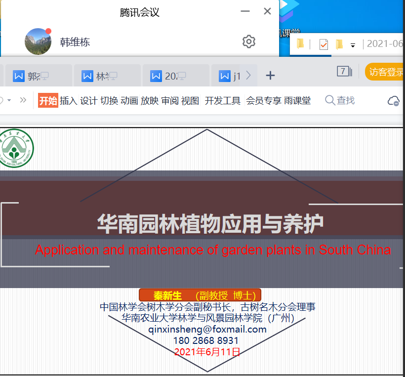 受广东海洋大学风景园林学科邀请,6月12日上午,中国林学会树木学分会副秘书长、中国林学会古树名木分会理事、华南农业大学林学专业主任秦新生博士、副教授,通过腾讯会议为我校师生作《华南园林植物应用与养护》专题线上学术报告,报告由广东海洋大学韩维栋教授主持,参加报告的有园林系教师、研究生、本科生及校外实习基地单位相关领导员工约60人。