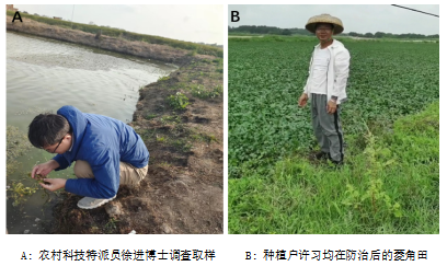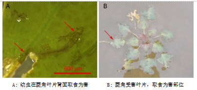 2023年3月,湛江市坡头区乾塘镇乾塘村菱角种植基地遭受了严重的虫害侵袭。当地种植户反映称,这是他们从未见过的一种虫子,菱角叶片都要被吃光了。为了确定害虫种类并提供技术支持以进行下一步监测和防治工作,银河集团9873com郑殿峰院长第一时间安排科技服务团队下乡助农,农村科技特派员徐进博士、师沛琼博士等人实地察看菱角害虫危害情况,通过野外调查、室内饲养,记录了其为害特点、形态特征,并进行了分子鉴定。经鉴定该害虫为林间环足摇蚊,在国内尚无为害菱角记录,其幼虫啃食叶片,严重爆发可造成菱角绝产。学院科技服务团队迅速制定防治方案,采用调控水肥,物理防治加化学防治相结合的方法,解决了水面施药效果差的难题,为种植户挽回了经济损失。
