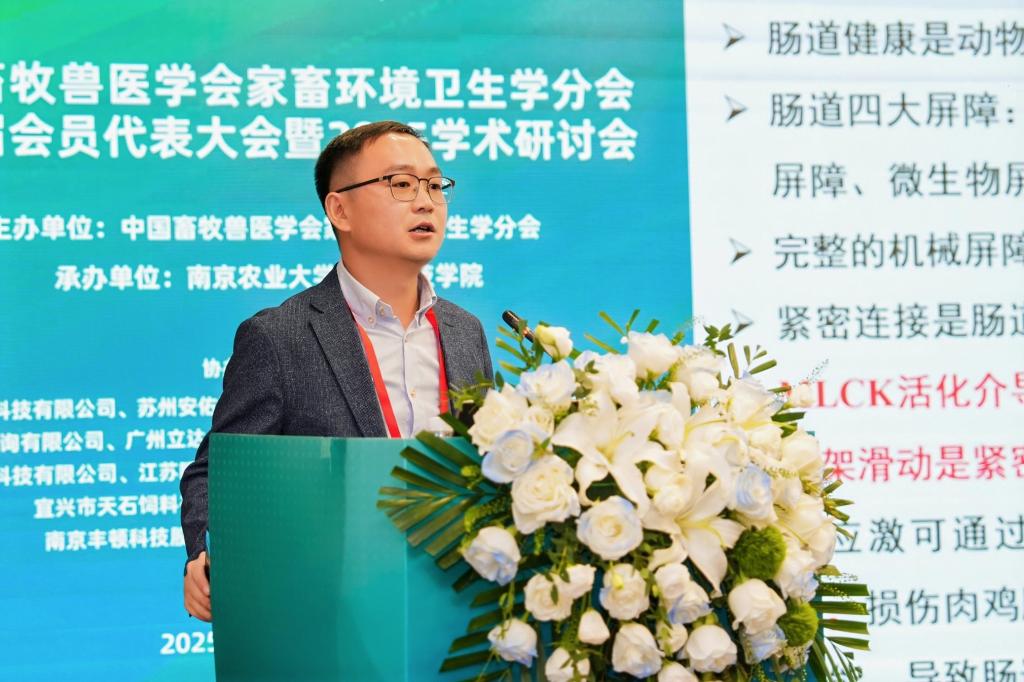 本次大会邀请了中国农业科学院北京畜牧兽医研究所熊本海研究员、南京农业大学朱伟云教授和赵茹茜教授、山东农业大学林海教授等专家做大会主旨报告,中国农业大学吴中红教授、浙江大学汪开英教授等25位专家做大会报告。刘文超受邀作了题为《褐藻寡糖通过AKK菌改善热应激肉鸡肠道机械屏障功能》的大会报告,详细介绍了我校畜牧学科历史沿革、发展现状,以及团队在海洋活性物质饲料化利用及肉鸡环境应激营养调控领域的最新研究进展。
