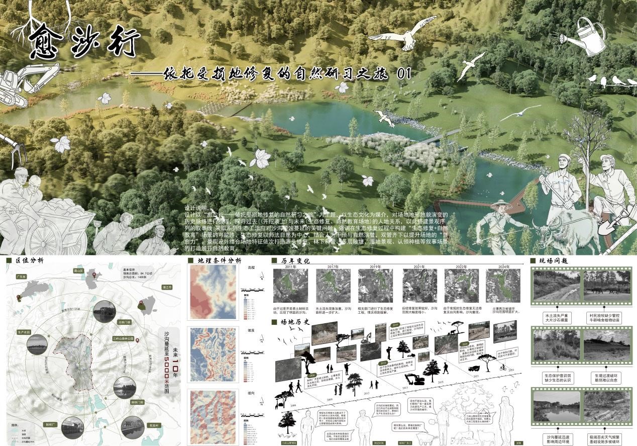 “中国好创意”大赛由全国高等院校计算机基础教育研究会共同主办,是数字艺术设计创意及电子技术创新领域的全国性综合赛事。赛事以促进“产、学、研”融合为核心,致力于挖掘创意精英人才。由黄艳娜老师指导,翁炜昌、刘舒淇、李志远、王誉彤、黄小慧五位同学组成的学生团队,凭借作品《愈沙行——依托受损地修复的自然研习之旅》,在空间设计类别中表现优异,荣获国赛级三等奖。同时,指导老师黄艳娜因卓越的指导工作,被授予“省级优秀指导教师”称号。